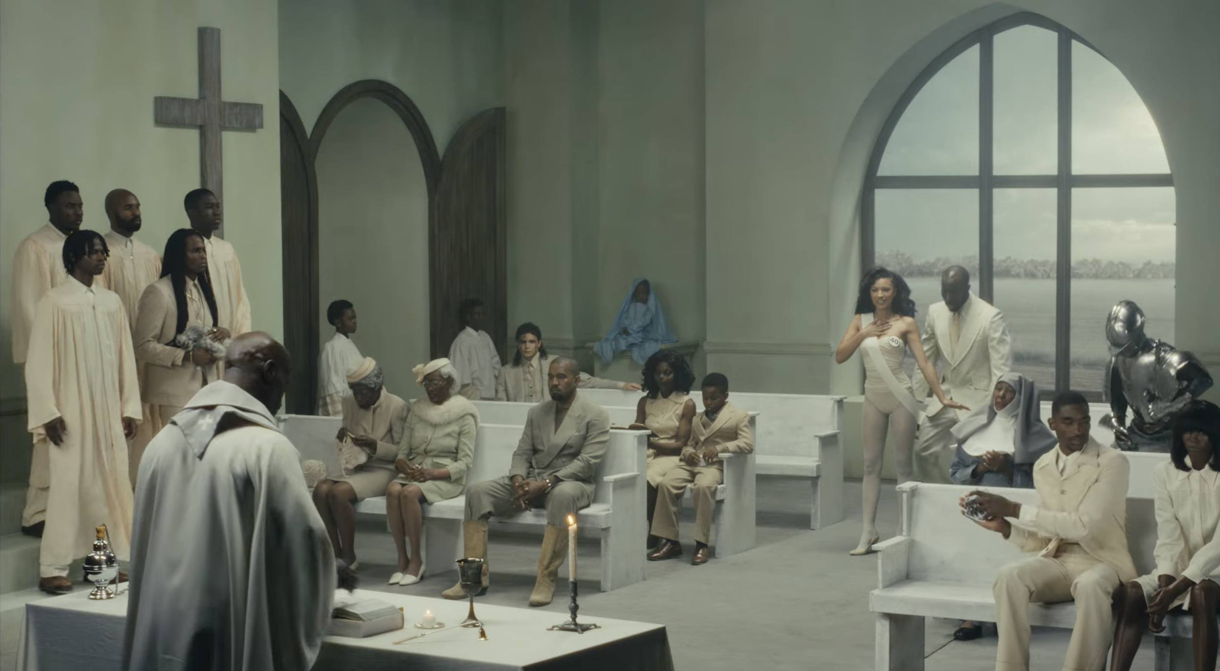 The video starts with a 5-man choir, four of them wearing neutral choir robes and one in a neutral beige suit holding what appears to be a feathered bird; all of them stepping from side-to-side in tune with the rhythm. Ye himself takes front and centre row whilst two elderly women sit to his right. Second row sits a mother with a face with feline features, besides her a ‘son’ who makes this church his own playground. To much of all of our surprise, the one and only Michael Jackson (impersonator) sits behind in the back row, unphased. On the other side of the aisle, sits two nuns, one of which couldn’t make it to their bed, sound asleep resting on others shoulders. In front of them sits a couple, the man in his own magical world and the woman couldn’t be further from him if she tried.